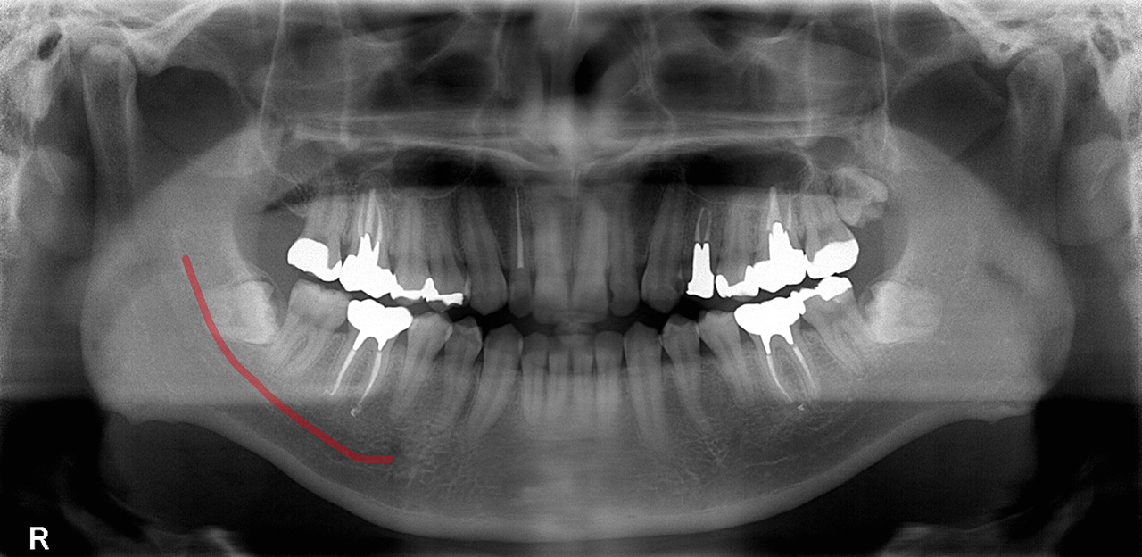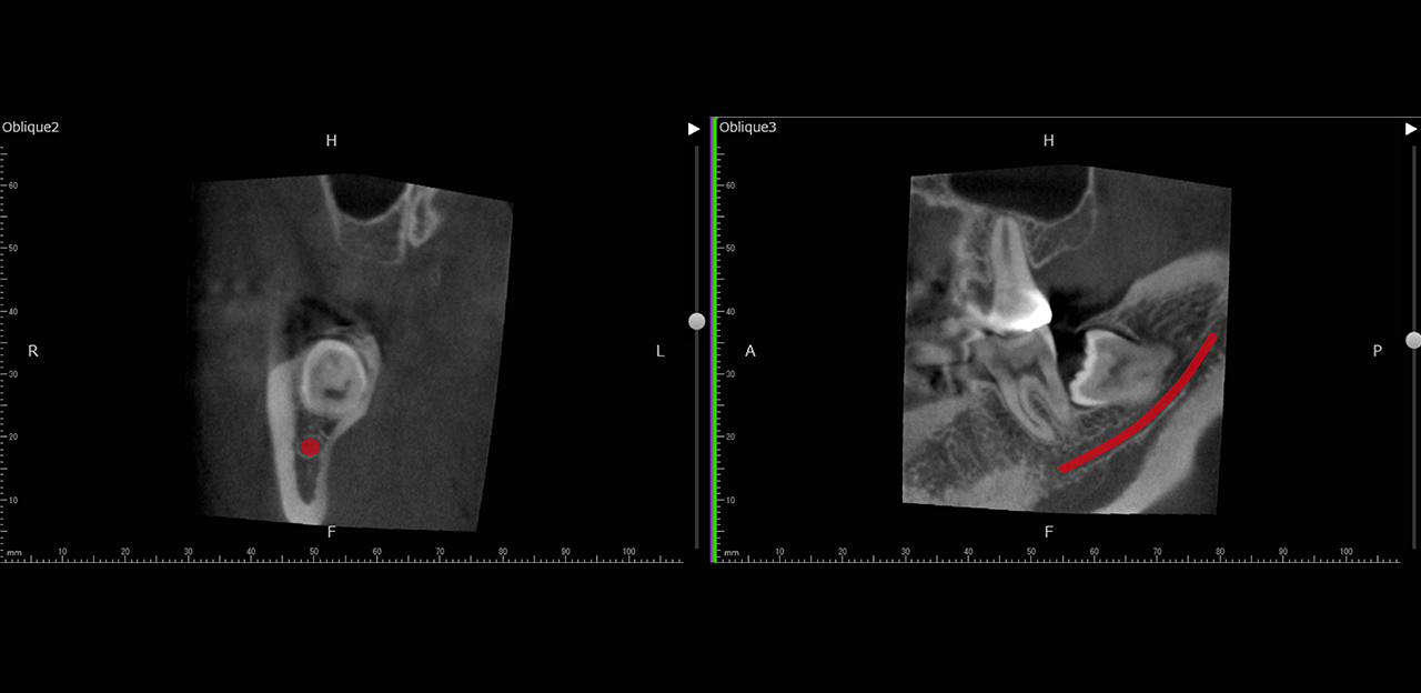 X線CT診断装置「SOLIO XZ MAXIM」下の画像をご覧ください。下顎の斜めに生えている親知らずに関して、左が二次元での撮影、右が三次元での撮影です。赤色の線が神経が通っている「管(下歯槽神経)」です。抜歯の際にはこの管を、傷つけない様に細心の注意を払って治療を行います。